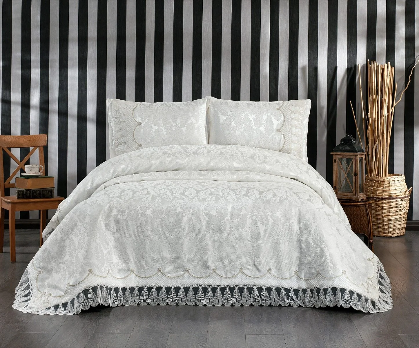 Fransız dantel detayları ile zenginleştirilmiş bu battal boy pike takımı, yatak odanızın atmosferini romantik bir dokunuşla tamamlar