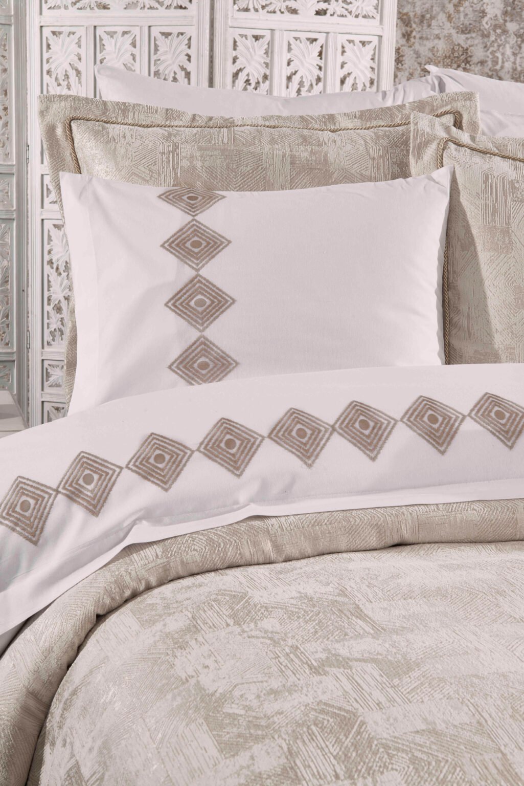 Tasarım: Zarif dantel işlemeleri ve özel pano baskılı yastıklarla zenginleştirilmiştir.