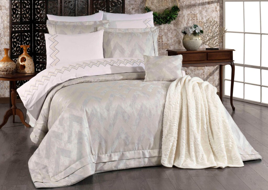 Set içerisinde yer alan yatak örtüsü, nevresim takımı ve yumuşacık battaniye, birbirleriyle tam uyumlu renk ve desenlerden oluşur. 6 adet yastık kılıfı (dantelli, desenli ve pano) ile yatağınızda katmanlı ve lüks bir otel konforu oluşturabilirsiniz.