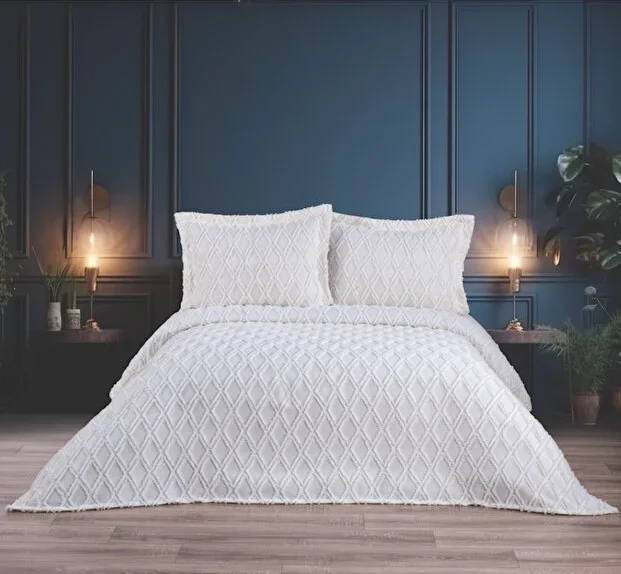 İskandinav Model Püsküllü Çift Kişilik Pike Takımı Ekru