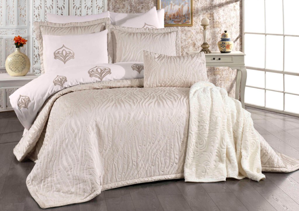 Set içerisinde yer alan yatak örtüsü, nevresim takımı ve yumuşacık battaniye, birbirleriyle tam uyumlu renk ve desenlerden oluşur. 6 adet yastık kılıfı (dantelli, desenli ve pano) ile yatağınızda katmanlı ve lüks bir otel konforu oluşturabilirsiniz.